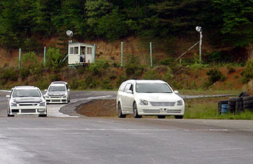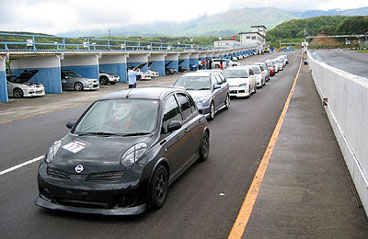 開催日1週間前より、現地の天気予報を気にしていましたが、当日は【雨】予報・・・。周りからのエントリーされるお客様からも・・・「週末、雨だねぇ〜」との声も・・・(汗。 少々憂鬱になりながらも、サーキット前日・当日の早朝まで雨・雨・雨・雨。今年は、ついてないなぁ・・・。と思いきや、空から神様が舞い降りました♪。集合時間の6:30頃まで大雨だったのが、ゲートオープンと同時に雨がやみました。おっ!!もしや・・・。願いも通じたか、7:30〜のドライバーズミーティングの時点では、路面はかなりウェット(水溜り)状態で、エントリーをされたお客様もミーティングの話を聞かず、コース状況を眺める方々もちらほらと・・・。もう、こうなったら急遽、当日のスケジュールを変更・・・。D-M氏よりの提案で、ドライバーズミーティング終了後、皆様のご協力を得て車をコースインさせ、一気に路面の水を乾かす大胆な行動!!予定よりも数十分遅れましたが、無事にハーフウエットでの走行開始となりました!毎年のスケジュールですと、A・B・C・Dの4クラス。1クラス約20分走行ですが、もちろん上級者から初心者まで・・・。今年は、参加台数がさほど集まらず、A〜Cまでのクラスで走行を行いました。そして、午後の最後には特別に与えられた【Dクラス】を設けてみました。特別なDクラス・・・。これは、フリー走行とゆう形でこの日1日のタイムに満足できなかった方や、走りに満足いかなかった人の為に、急遽1クラス設けてみました。※ですが、走られる方って何故か顔ぶれが偏ってくるんですよね(汗
